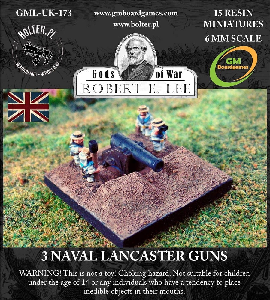 Zestaw zawiera 3 paski marynarzy kanonierów, po 4 figurki na pasku i 3 morskie armaty 68-funtowe typu Lancaster, w sumie 15 żywicznych modeli w skali 6 mm.