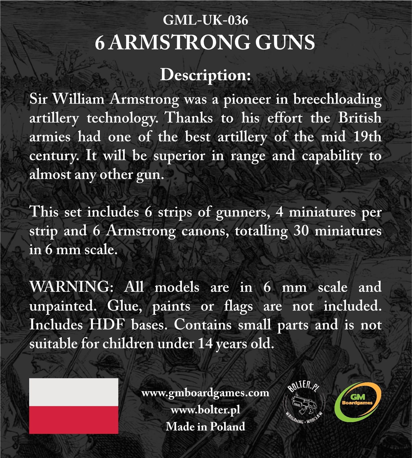 UWAGA: Wszystkie modele są wykonane w skali 6 mm i nie są pomalowane. Klej, farby, ani flagi nie są częścią zestawu. W zestawie są podstawki z HDF’u. Zestaw zawiera małe części i nie jest przeznaczony dla dzieci poniżej 14. roku życia.