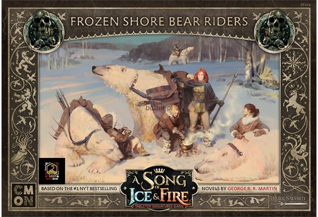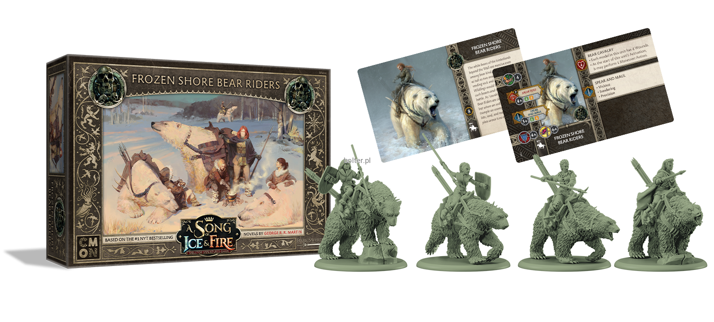 Białe niedźwiedzie z głębi krain za Murem są niezwykle potężne, nawet w porównaniu do najokazalszych egzemplarzy niedźwiedziego gatunku. Stojąc, osiągają wzrost dwóch mężczyzn, a potworna siła umożliwia im kruszenie skał i rozrywanie stali. Tylko Dzicy mogli wpaść na tak szalony pomysł, by okiełznać te bestie i na ich grzbietach ruszać do bitwy. Jako „kawaleria” Niedźwiedzi Jeźdźcy z Mroźnego Brzegu są dość powolni i ociężali. Ale podczas gdy konno możesz co najwyżej stratować przeciwnika, niedźwiedź potrafi również gryźć, rozszarpywać i miażdżyć – nawet mężczyzna w pełnej, płytowej zbroi jest dla niego jedynie igraszką.