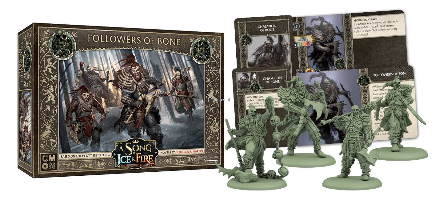 Wielu mieszkańców Westeros uważa członków armii Wolnych Ludów za dzikusów, a wielu Dzikich zdaje się robić wszystko, by wzmocnić to odczucie. Wyznawcy Kości są oddani Władcy Kości i przyozdobili się w szereg makabrycznych szkieletowych akcesoriów, dodatkowo używając ich jako broni w walce. Ich niepokojące praktyki i wygląd mają ogromny wpływ na morale wroga. Zestaw jednostek Wyznawcy kości daje dowódcom Wolnych Ludów nową, przerażającą jednostkę, która wypełni ich szeregi. Przerażające oblicza tych wojowników mogą sprawić, że wrogowie cofną się w panice zamiast atakować. Przymusowe testy paniki przed wykonaniem ataku to coś co każdy dowódca bazujący na strachu uwielbia wykorzystać. Jeśli weźmiemy do tego pod uwagę znajdujący się w pudełku dodatek Czempiona Kości, który potrafi dodatkowo osłabić morale przeciwnika i zwiększyć jego straty z testów paniki - otrzymujemy bardzo mocną kombinację.