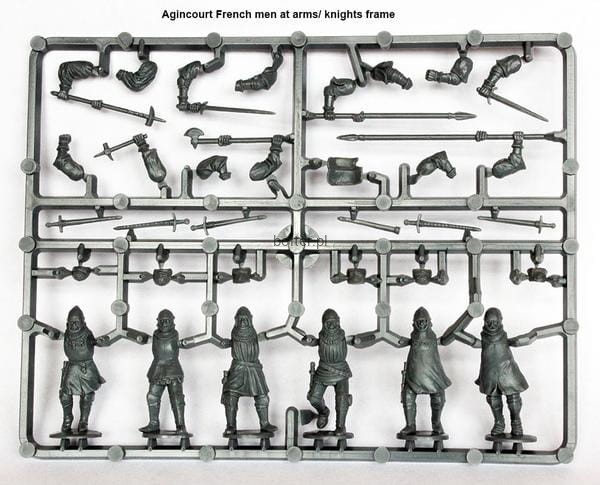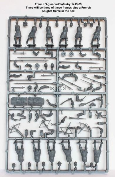 The set consists of 36 plastic French Infantry and 6 knights/men at arms. The infantry are armed with spears, crossbows, double handed axes and hand weapons. The knights have cut-down lances/spears, pole arms and swords.