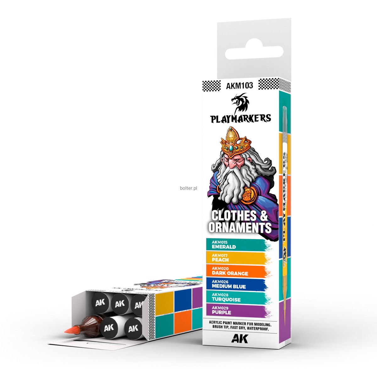AK Interactive: Playmarkers - Clothes & Ornaments (6) zawiera 6 markerów o kolorach: