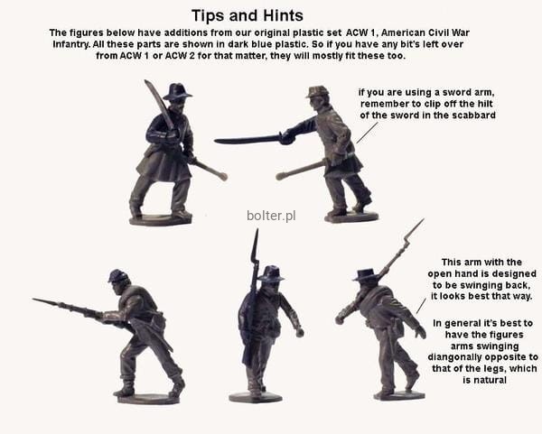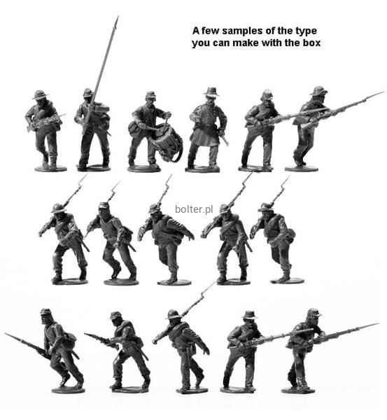 The figures in this box represent a Confederate infantry regiment form 1862 onwards although there are a fair amount of units that can be depicted from 1861 too. They are all represented in short jackets typical of the entire Confederate Army from mid-1863. Both caps and broad-brimmed hats are included for all figures as some regiments adopted the hat and others the cap, although most had a mix. All figures have separate arms to allow you build the regiment at right shoulder shift or at the charge.