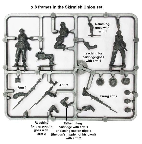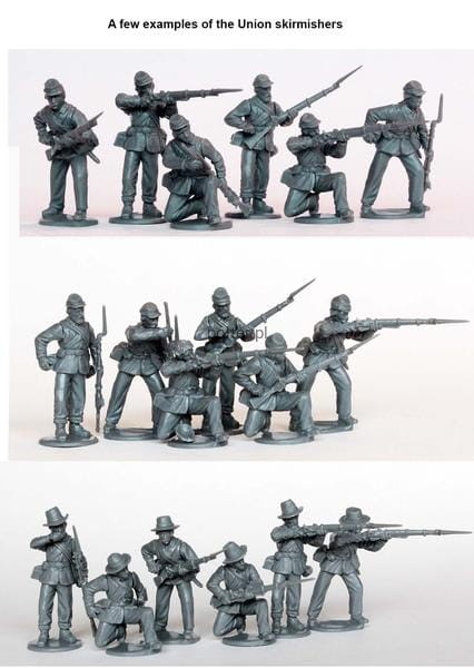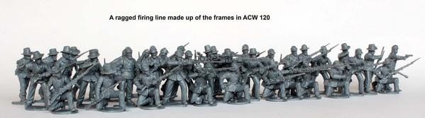 The figures in this box are in skirmishing poses; firing, loading and running. They are all in sack coats and have the choice of either forage caps or broad-brimmed hats. The figures are the same as the Union box ACW 115 but are a different mix to allow a skirmish force to be built. You could also create a ragged firing line with most of the the figures too.