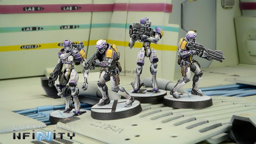 This box includes four miniatures: One Arjuna with Spitfire, one Arjuna with Boarding Shotgun and two Kiranbots equipped with E/Marat and Cybermines. The Arjuna troops are ideal for close quarters control of the game table, taking advantage of their synchronized Kiranbot and being able to take advantage of their Specialist Operative Skill to fulfil different missions.