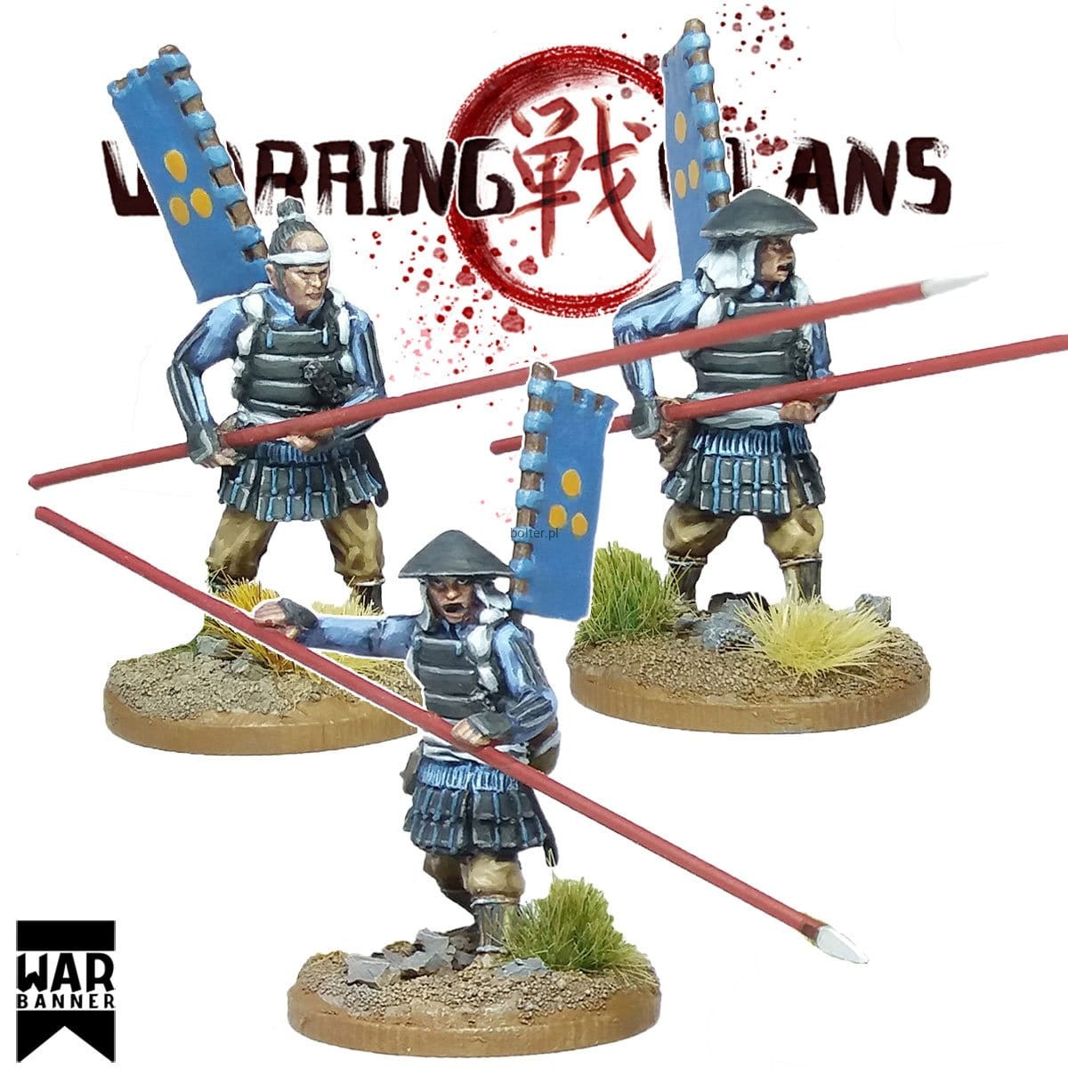 The absence of a national standing army forced landowners to rely on hired foot soldiers known as ashigaru. This set of three such ashigaru are armed with straight-headed spears called yari.