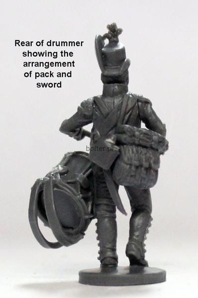 The command consists of an officer, standard bearer, drummer, sapper and two NCOs. The box contains heads for all figures with either helmets ( the helmet was last used in 1809), shakos (used from 1809-15) or the Landwehr corse-hut. Although the figures are designed for 1809 onwards as they have the 1808 higher-waisted coat, you could use them for the 1805 campaign if you ignore that detail.