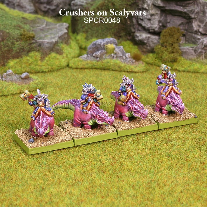 The set contains 4 two-piece high-quality resin miniatures of Crushers on Scalyvars (4 riders and 4 mounts), and four 25 mm square plastic bases.