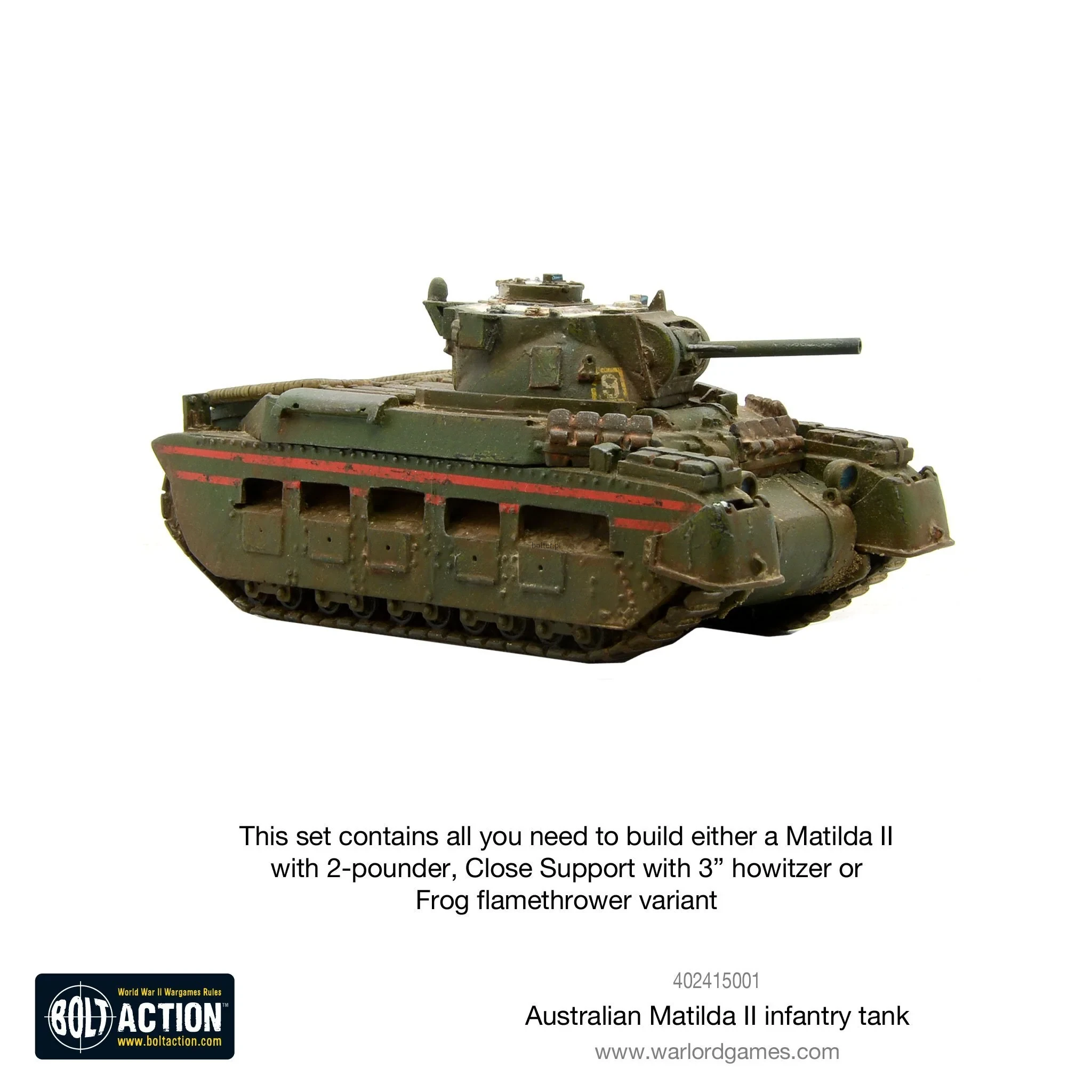 This set contains all you need to build either a Matilda II with 2-pounder, Close Support with 3” howitzer or Frog flamethrower variants.