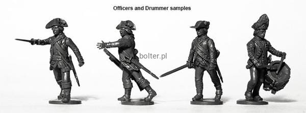 They are represented in cut-down coats for campaign and come with three hat variants; the typical cocked hat, the un-cocked hat or board brimmed hat and the Saratoga cap, cut down from the cocked hat.
