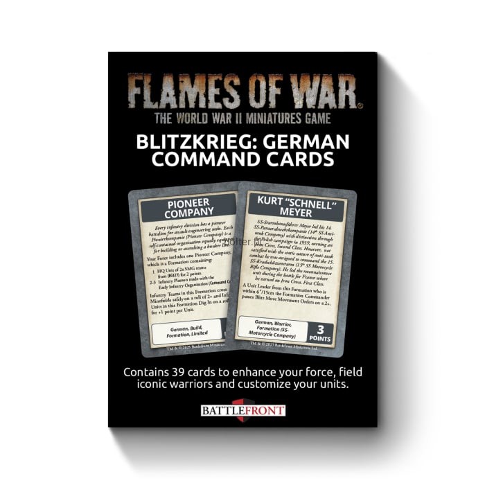 The Blitzkrieg German Command Card pack contains 39 Command Cards to enhance your force, field iconic warriors and customize your units!