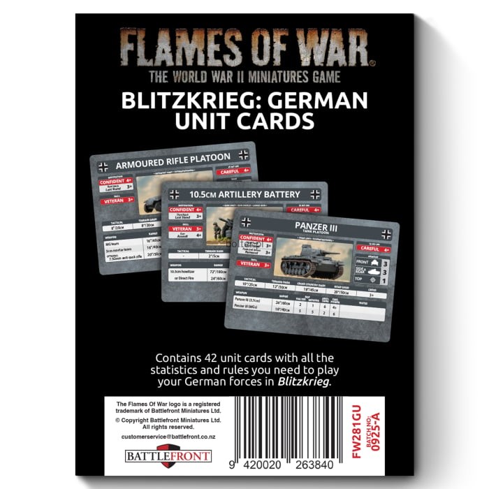 The Blitzkrieg German Unit Card pack contains 43x Unit Cards to help you reference and build your forces!