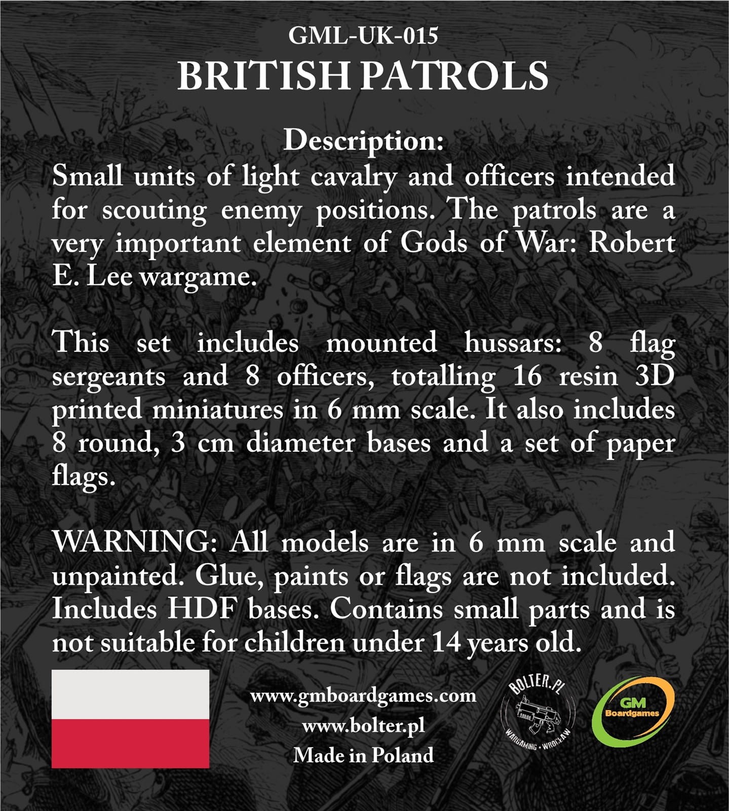 Ten zestaw zawiera jeźdźców na koniach, 8 chorążych i 8 oficerów, razem 16 żywicznych figurek w skali 6 mm. Zawiera również 8 okrągłych podstawek o średnicy 3 cm i zestaw papierowych sztandarów.