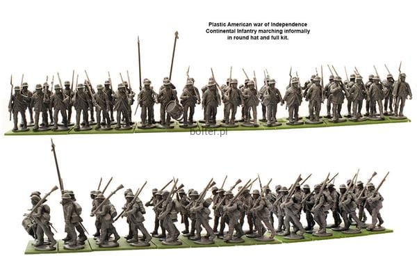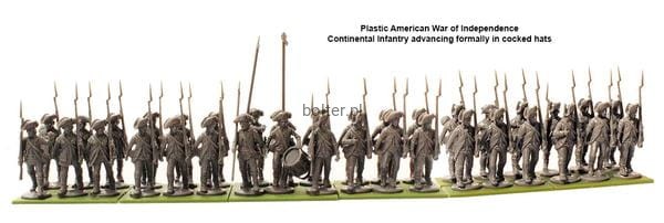 The box contains 38 Continental Infantry with the option of four to six command figures and up to four Riflemen. All the rank and file can be assembled in either formal or informal marching poses. Four figures on the 'Rifleman' sprue can be made up as either riflemen skirmishing or Continentals marching (formal and informal) in hunting shirts. These can be mixed in with the rest of the infantry, who are wearing coats, to create a less regular look to the unit. The command sprue offers the option of up to three officer types and up to two standard bearer options. A drummer and two sergeant arms are also included with all the figures in the box, you also have the choice of three different types of head gear; the cocked hat, the short-brimmed round hat and a peaked cap.
