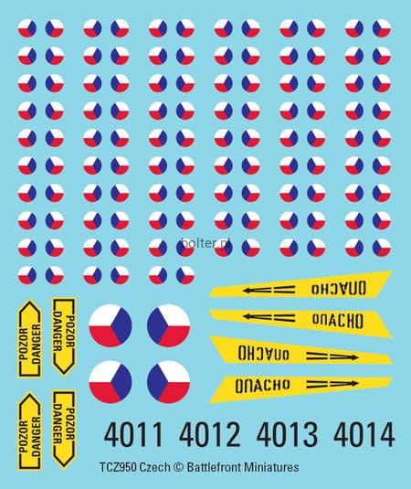 Each of the three decal packs (Czechoslovakian, Polish and East German) contain two National Symbol coloured decal sheets that give you enough markings for four Hind Helicopters and over 100 vehicles. The packs also include two generic vehicle number sheets to personalise your Companies and Platoons.