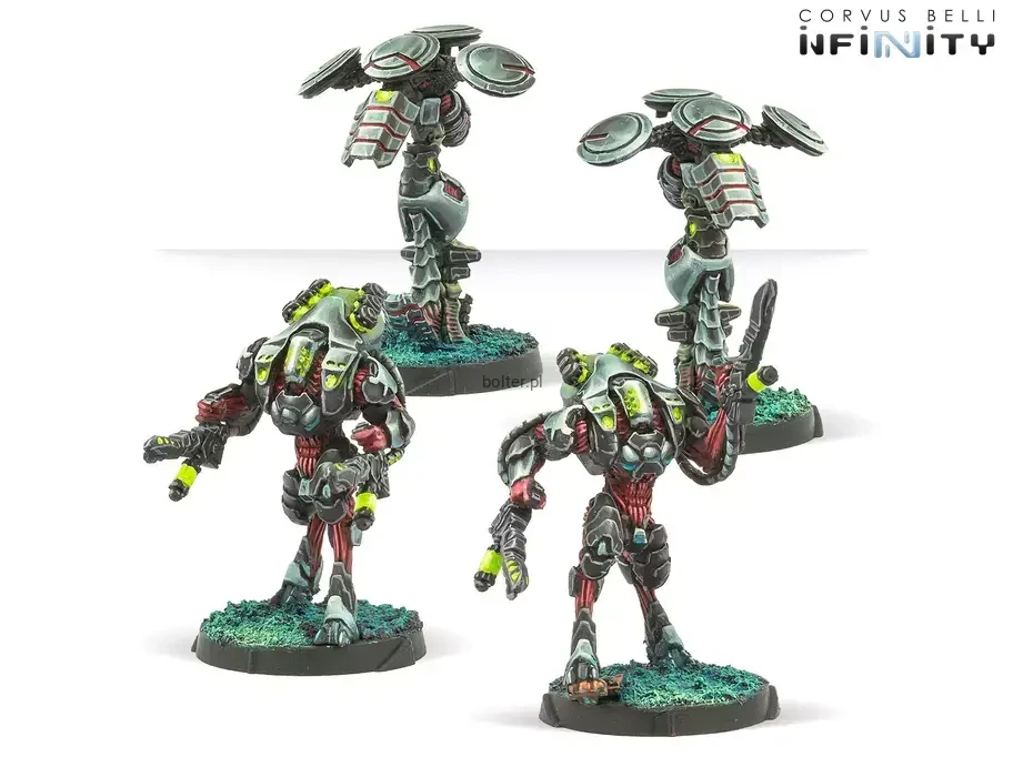 This box includes 4 miniatures: 2 Imetrons plus 2 Batroid Ikadrones with Baggage, Repeater and Heavy Flamethrower. The Imetrons will afford greater versatility to your Combined Army and Onyx Contact Force lists, while the Ikadrons will provide the valuable equipment they carry to reinforce any list of the Combined Army and any of its Sectorial Armies.