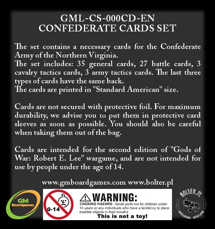 The cards are for II. edition of Gods of War: Robert E. Lee. The game is not intended for persons under the age of 14.