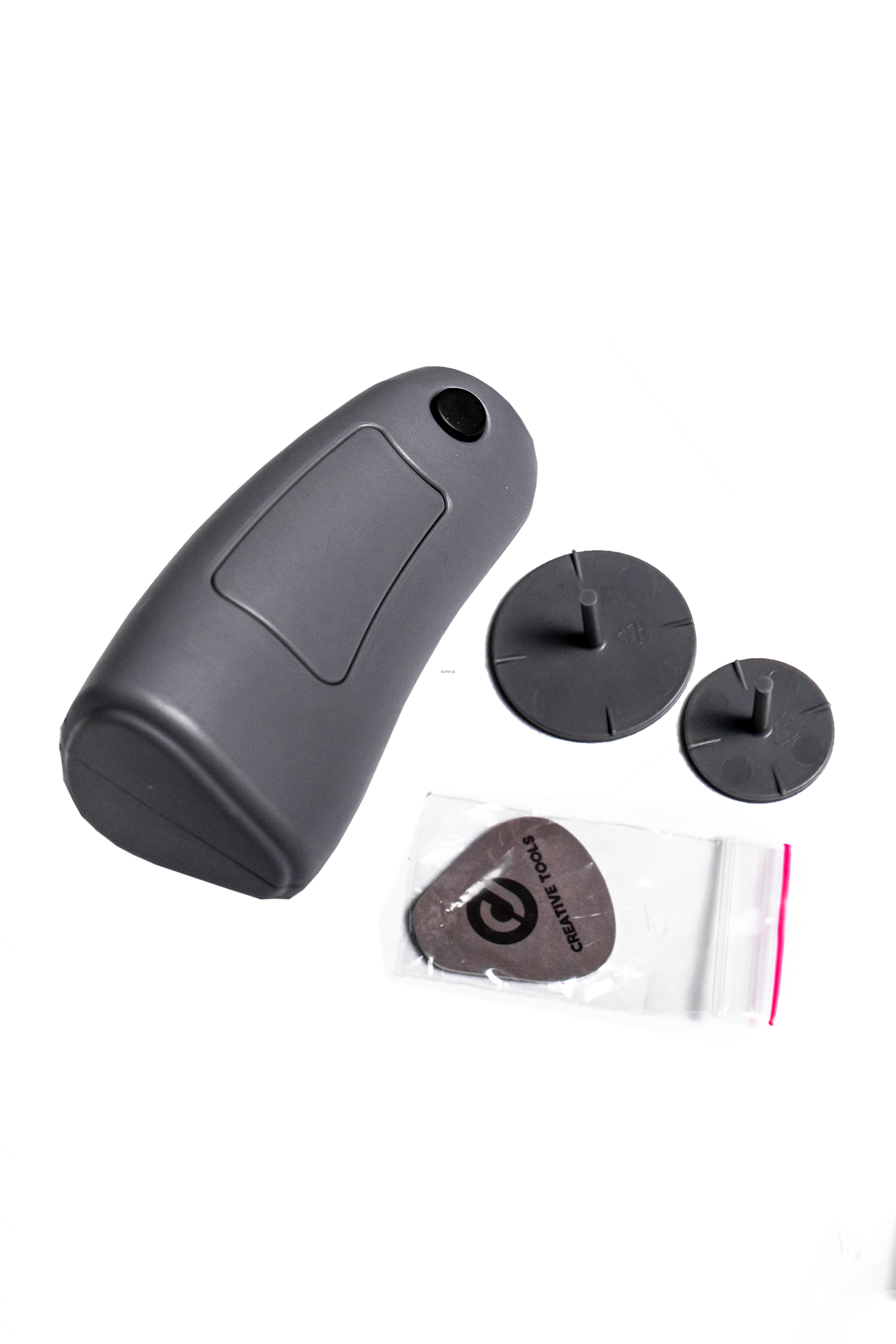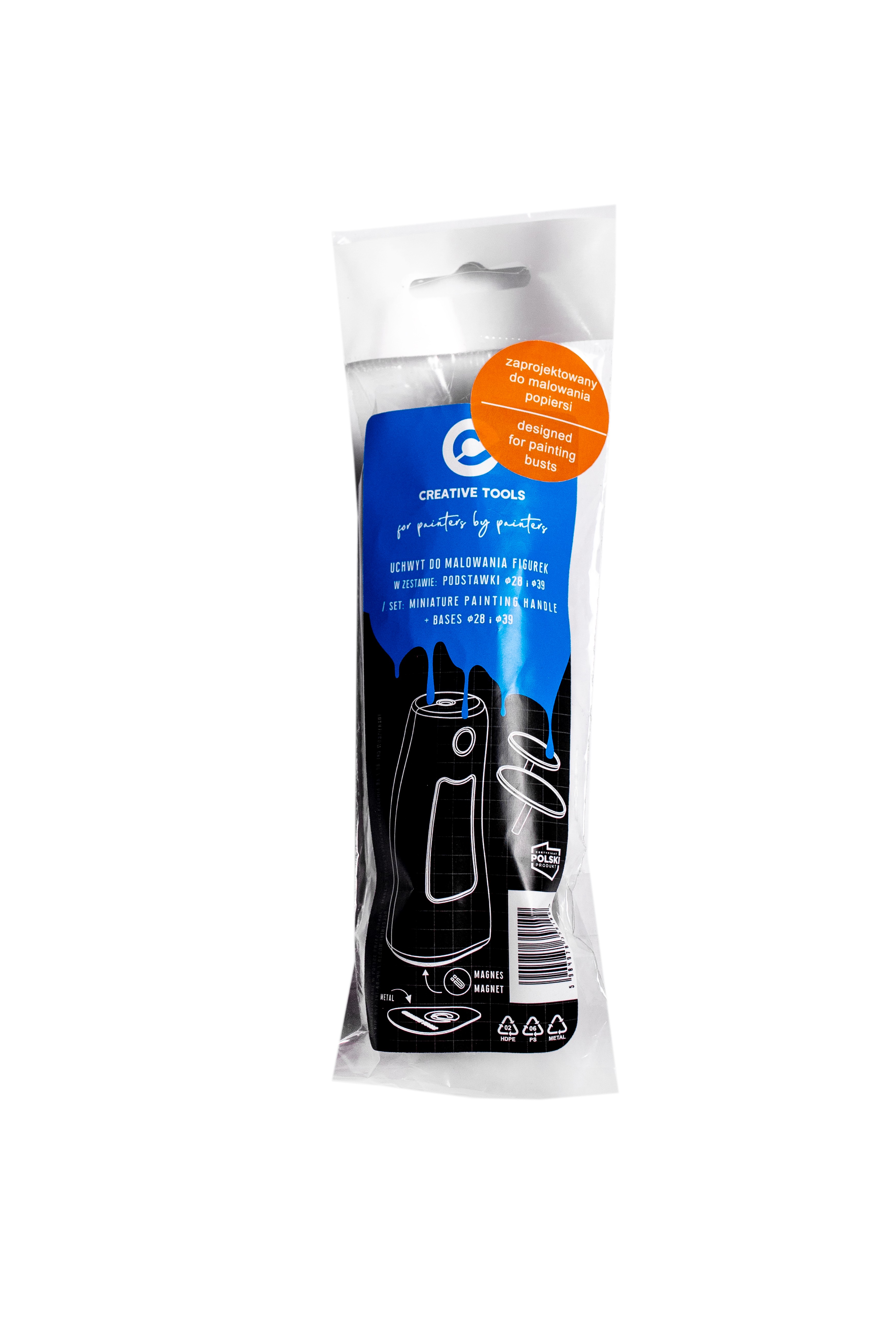Mniejsza wersja klasycznego uchwytu do malowania figurek Creative Tools, 8,5 cm wysokości, ergonomicznie dopasowany do dłoni przeciętnego Europejczyka, pomaga zmniejszyć napięcie mięśni podczas malowania.