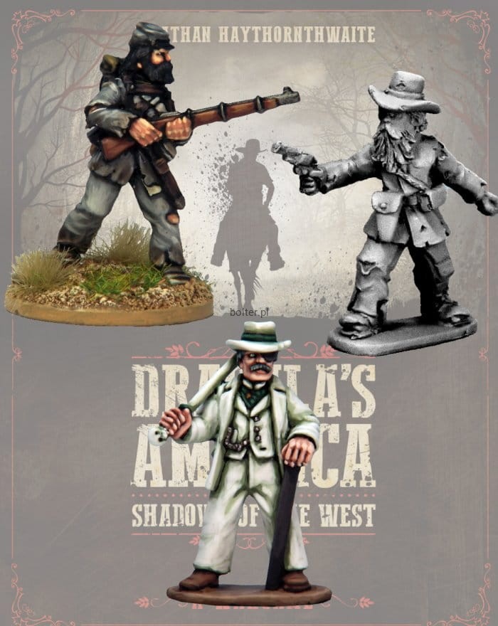 The Dark Confederate Necromancer and two ragged Ex-Confederate soldiers, part of the Dark Confederacy Posse.