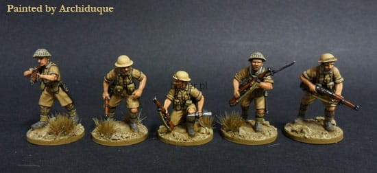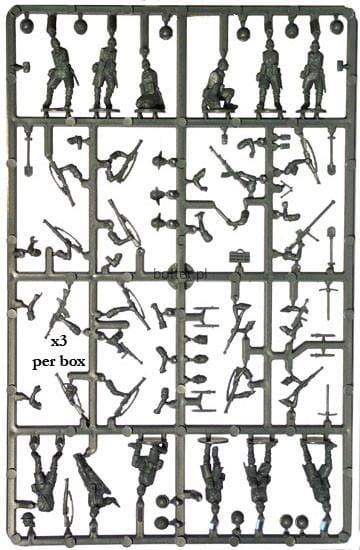 38 hard plastic multipose British or Commonwealth infantry for the desert war. There are enough to make a platoon of 3 sections plus an HQ section. Also included are 32x 20mm circular and 4x 40mm square bases (for the support teams).