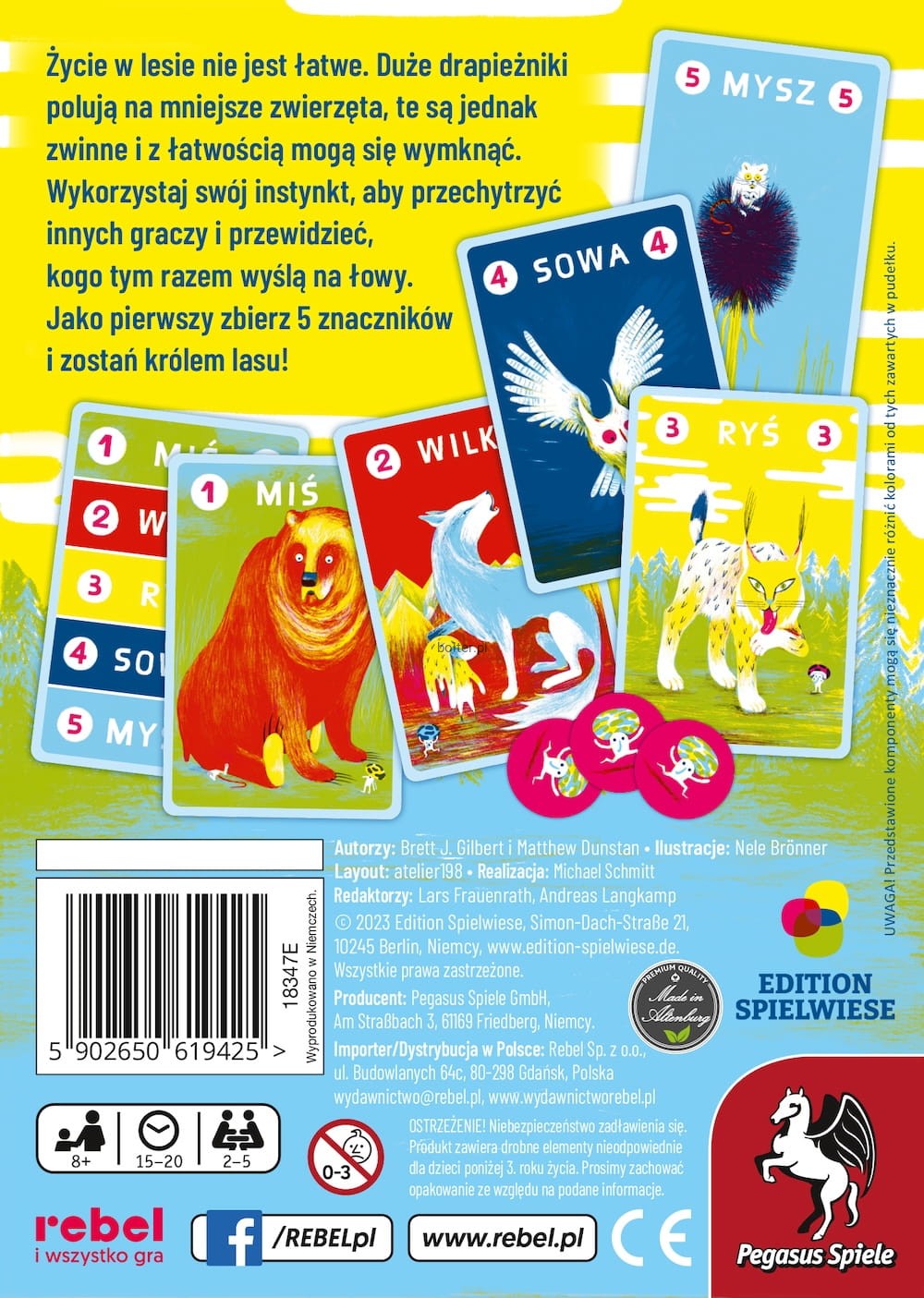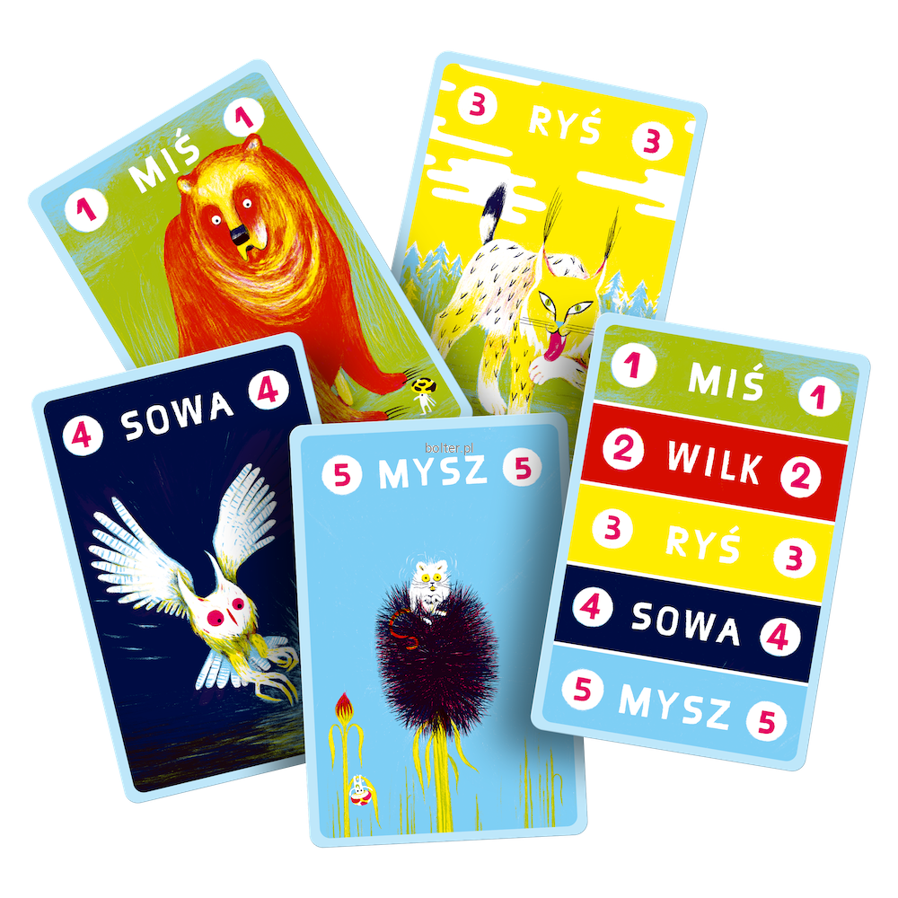 Je się w lesie to prosta gra karciana, w której starasz się skutecznie zapolować, a przy tym samemu nie stać się zwierzyną. Do dyspozycji masz zestaw zwierzaków: misia, wilka, rysia, sowę oraz mysz. Zgodnie z regułami rządzącymi przyrodą, duże drapieżniki polują na mniejsze zwierzęta, te są jednak zwinne i z łatwością mogą się wymknąć. Wykorzystaj swój instynkt, aby przechytrzyć innych graczy i przewidzieć, kogo tym razem wyślą na łowy. Jako pierwszy zbierz 5 znaczników i zostań królem lasu!