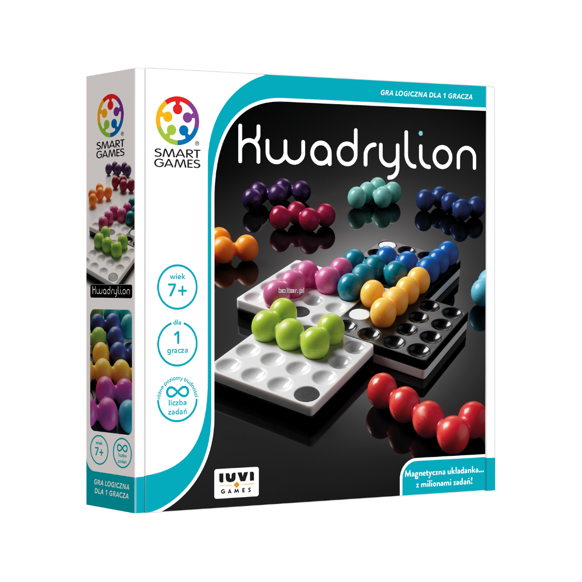 Jedna gra - miliony możliwości! ,,Kwadrylion" to magnetyczna gra logiczna, gdzie korzystając z przygotowanych, lub tworząc własne warianty plansz, gracz rozwija przestrzenne i logiczne myślenie! Przygotuj plansze i umieść na niej 12 elementów - to takie proste! Ale czy na pewno? Przekonaj się grając samodzielnie lub z dzieckiem.