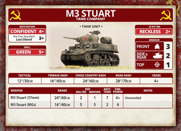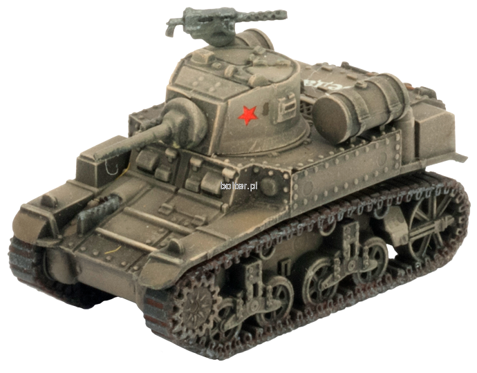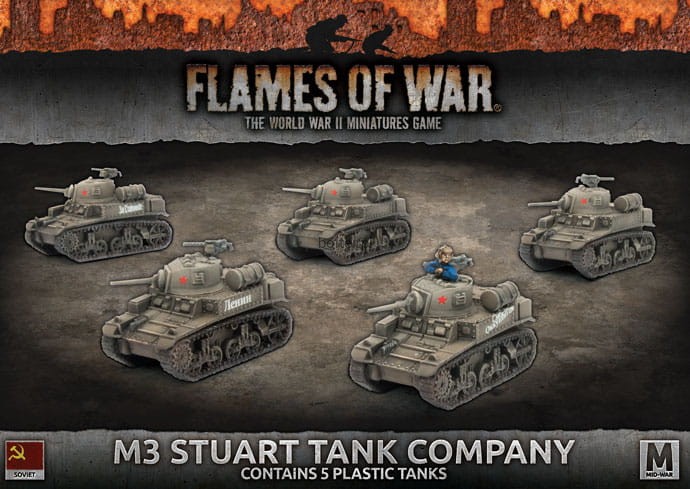 Includes five plastic M3 Stuart tanks, one plastic Tank Commander sprue, one Decal sheet and three Unit Cards.