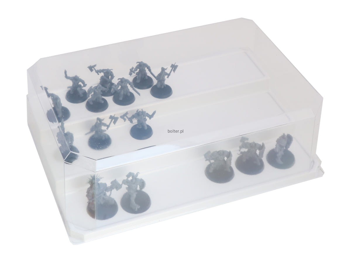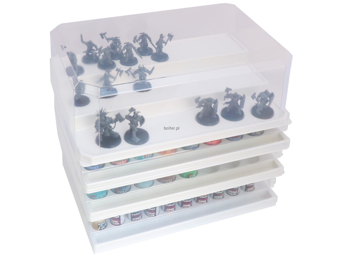 Dzięki naszemu rozwiązaniu ochronisz swoje modele przed kurzem i brudem, które mogą się gromadzić na modelach podczas dłuższych przerw w malowaniu. Zestaw składa się z plastikowej podstawy z 3 półkami na modele oraz plastikowej przezroczystej osłony. Każda półka posiada doklejoną warstwę folii ferromagnetycznej, do której można przymocować modele na zmagnesowanych podstawkach.