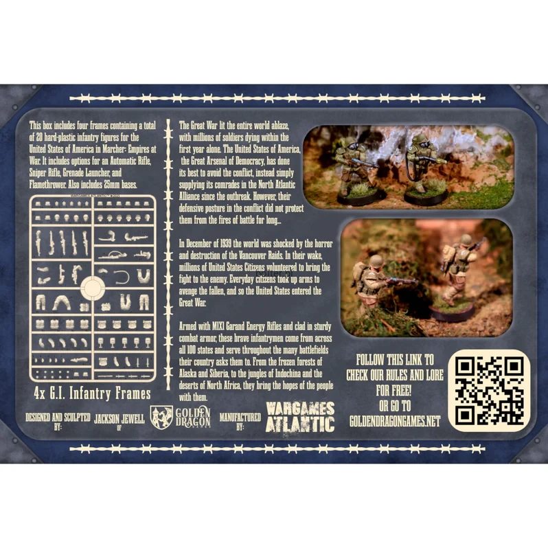This box includes four frames containing a total of 20 hard-plastic infantry figures for the United States of America in Marcher: Empires at War. It includes options for an Automatic Rifle, Sniper Rifle, Grenade Launcher, and Flamethrower. Also includes 25mm bases.