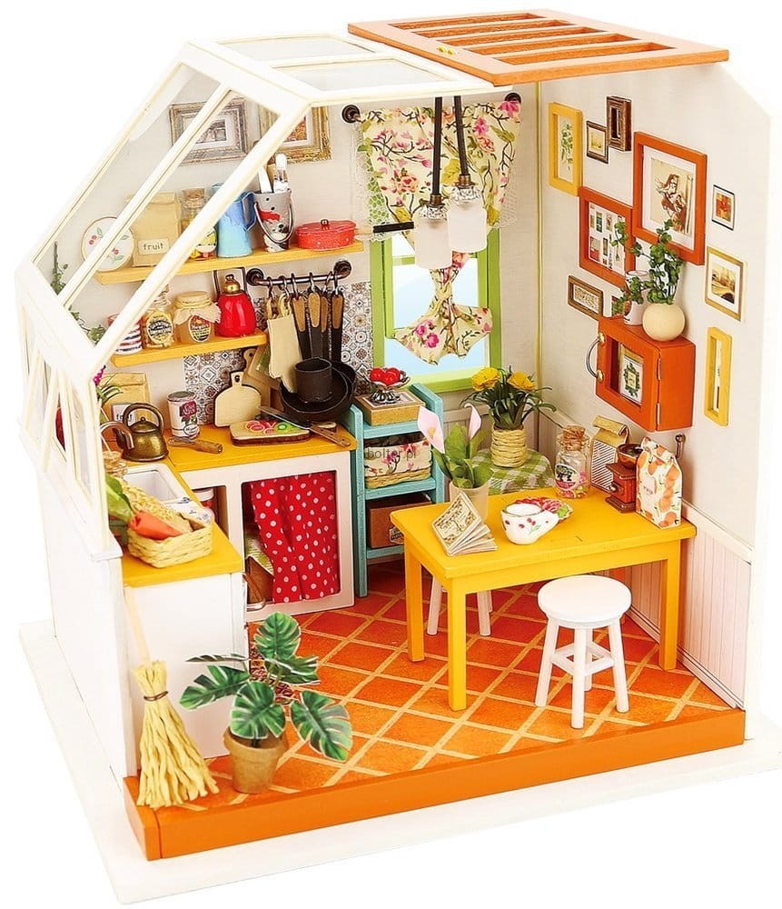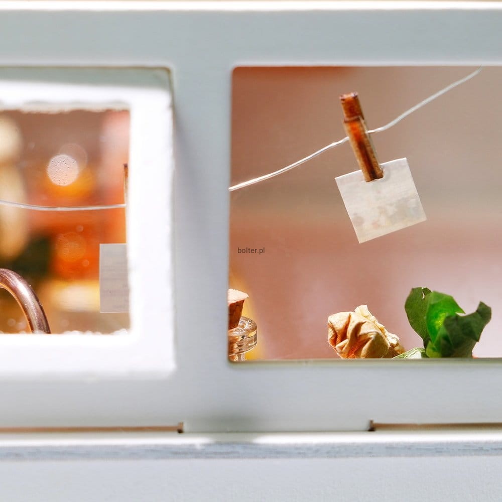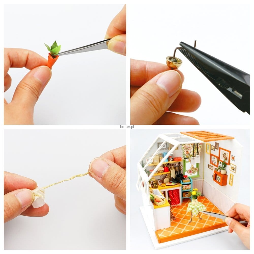 Zestaw umożliwiający złożenie miniaturowej kuchni z oświetleniem LED. Do budowy modelu wykorzystano między innymi drewno, papier, tkaniny, drut, tworzywo sztuczne oraz różne elementy dekoracyjne takie jak: kolorowe ozdoby, cekiny, koraliki, sztuczne kwiaty oraz wiele innych materiałów. Dodatkowego uroku nadaje całości oświetlenie LED, dzięki któremu kuchnia może pełnić rolę nastrojowej dekoracji lub lampki nocnej. Opakowanie oprócz czytelnej, obrazkowej instrukcji zawiera także baterie, pędzelek, farby akrylowe, przezroczysty, bezwonny klej oraz pęsetę ułatwiającą montaż małych elementów. Budowa tego modelu pomoże rozwinąć zdolności manualne i przyniesie dużo satysfakcji.