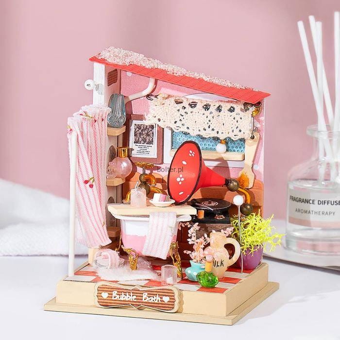 Zestaw umożliwiający złożenie miniaturowej łazienki. Do budowy modelu wykorzystano między innymi drewno, papier, tkaniny, drut, tworzywo sztuczne oraz różne elementy ozdobne takie jak: kolorowe cekiny, koraliki, sztuczne kwiaty oraz wiele innych materiałów. Pracownia jest ciekawie zaprojektowana, posiada wiele drobnych detali, a po złożeniu ma niewielkie rozmiary, dzięki czemu może pełnić rolę oryginalnej dekoracji. Opakowanie oprócz czytelnej, obrazkowej instrukcji zawiera także przezroczysty, bezwonny klej oraz pęsetę ułatwiającą montaż małych elementów. Budowa tego modelu pomoże rozwinąć zdolności manualne i przyniesie dużo satysfakcji.