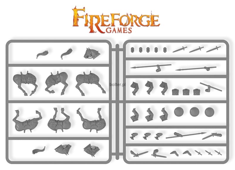 This box will allow you to assemble 6 mounted figures; up to 6 with sword OR up to 6 with lances. You can assemble up to 6 figures with shields OR up to 6 figures holding reins. The Command options will allow you to assemble one Leader, one Musician and one Standard Bearer. Horses come with 3 different pairs of half-bodies with 3 different heads and 3 different tails (you will have 27 different horse configurations).