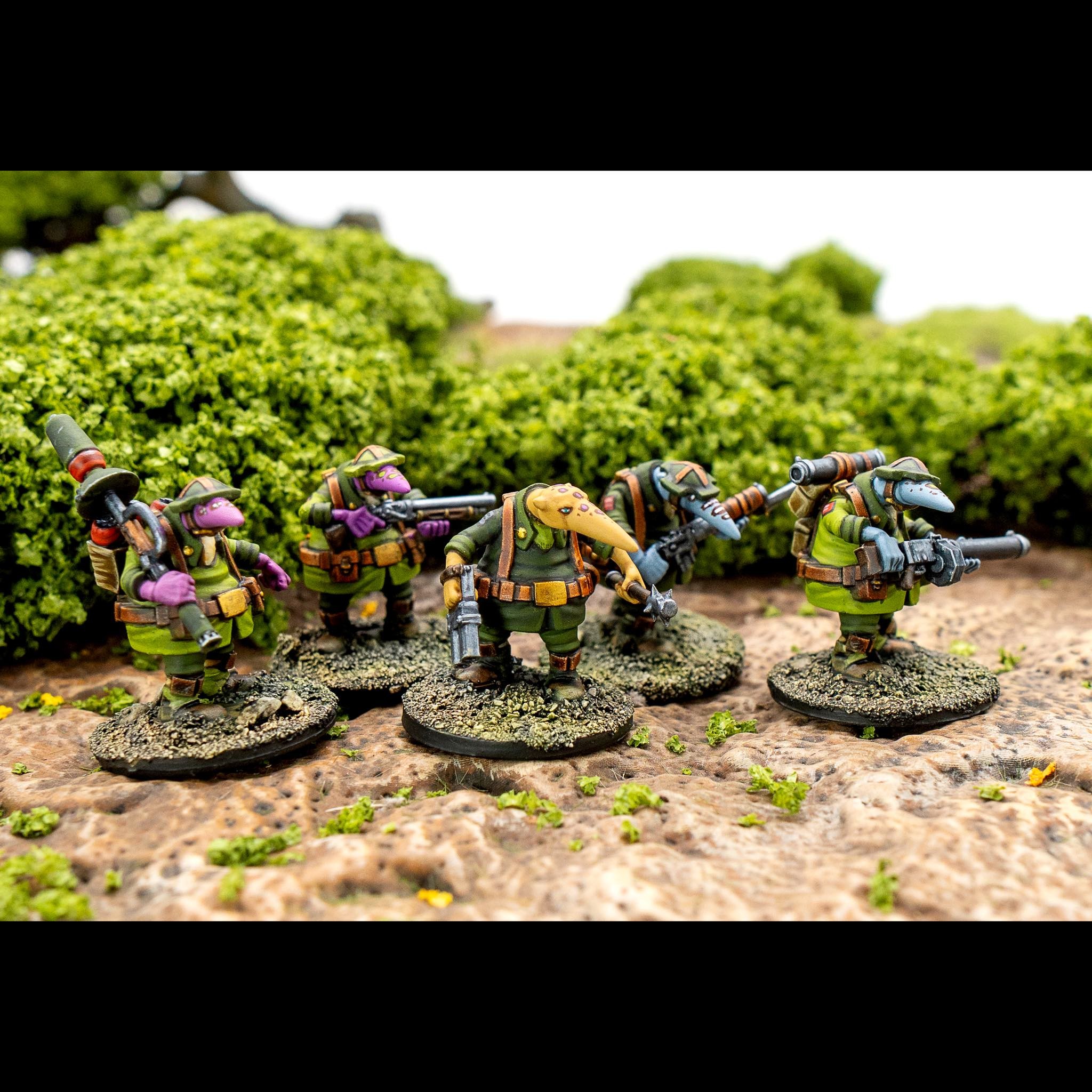 Trench Raiders lead brutal assaults clearing bunkers and trenches with grenades, clubs, and sheer ferocity. H-11a gunners provide mobile suppressive fire to pin enemies in place and cover their company’s advances. Torpedo Troopers carry volatile, short-range anti-tractor launchers that can turn even the most fortified enemy positions into rubble. While Pathfinders force ahead of the main body identifying and sometimes neutralizing threats.
