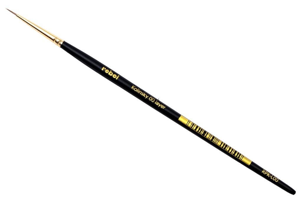 Rebel: Pędzel Kolinsky naturalny - Layer - 00 to wysokiej jakości pędzel do malowania farbami akrylowymi. Wyselekcjonowane włosie łasicy Kolinsky to jedno z najlepszych włosi w zastosowaniu w malarstwie. Spiczasta końcówka, elastyczność włosia oraz duża zdolność utrzymywania farby sprawiają, że jest to pędzel przeznaczony dla malarzy szukających wysokiej jakości produktu.