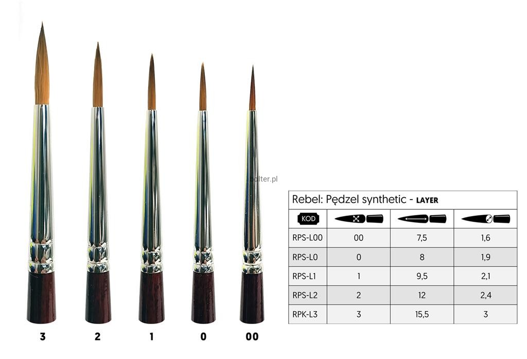 Rebel: Pędzel Kolinsky syntetyczny - Layer - 00 to pędzel doskonały zarówno do farb speedpaint i akrylowych, jak i do rozprowadzania innych mediów malarskich. Najwyższej jakości imitacja włosia Kolinskiego tak dobrana, by była najbardziej zbliżona oryginałowi. Szpic, wysoka elastyczność, duża zdolność utrzymywania farby oraz zachowanie kształtu włosia sprawiają, że będzie to jeden z najlepszych pędzli syntetycznych dostępnych na rynku.