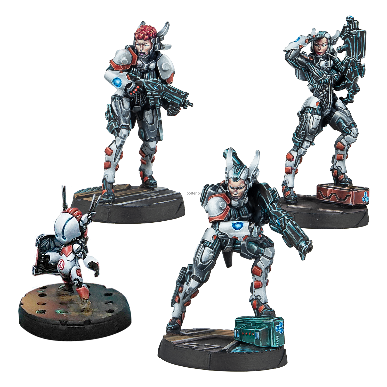 This box includes four metal miniatures: a Riot Grrl with Combi Rifle and E/Mitter, a Riot Grrl with Missile Launcher, a Riot Grrl with Boarding Shotgun, and one TinBot. This new Infinity unit box provides all the weapon options needed. Now you can compose a Fireteam of these Heavy Infantry from the Bakunin Sectorial Army.