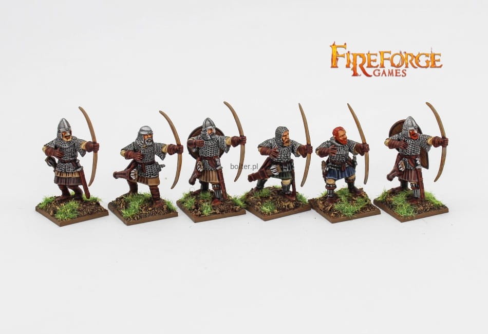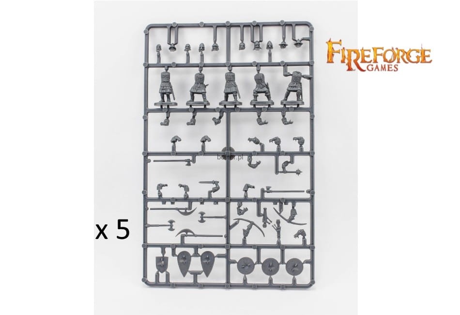 This box enables you to build up to 25 Post-Viking Scandinavian Infantry soldiers in heavy armour. You'll be able to build up to 10 Bowmen, and/or up to 10 armed with two-handed axe, and/or up to 5 armed with sword, and/or up to 5 armed with mace, and/or up to 24 armed with Spear.