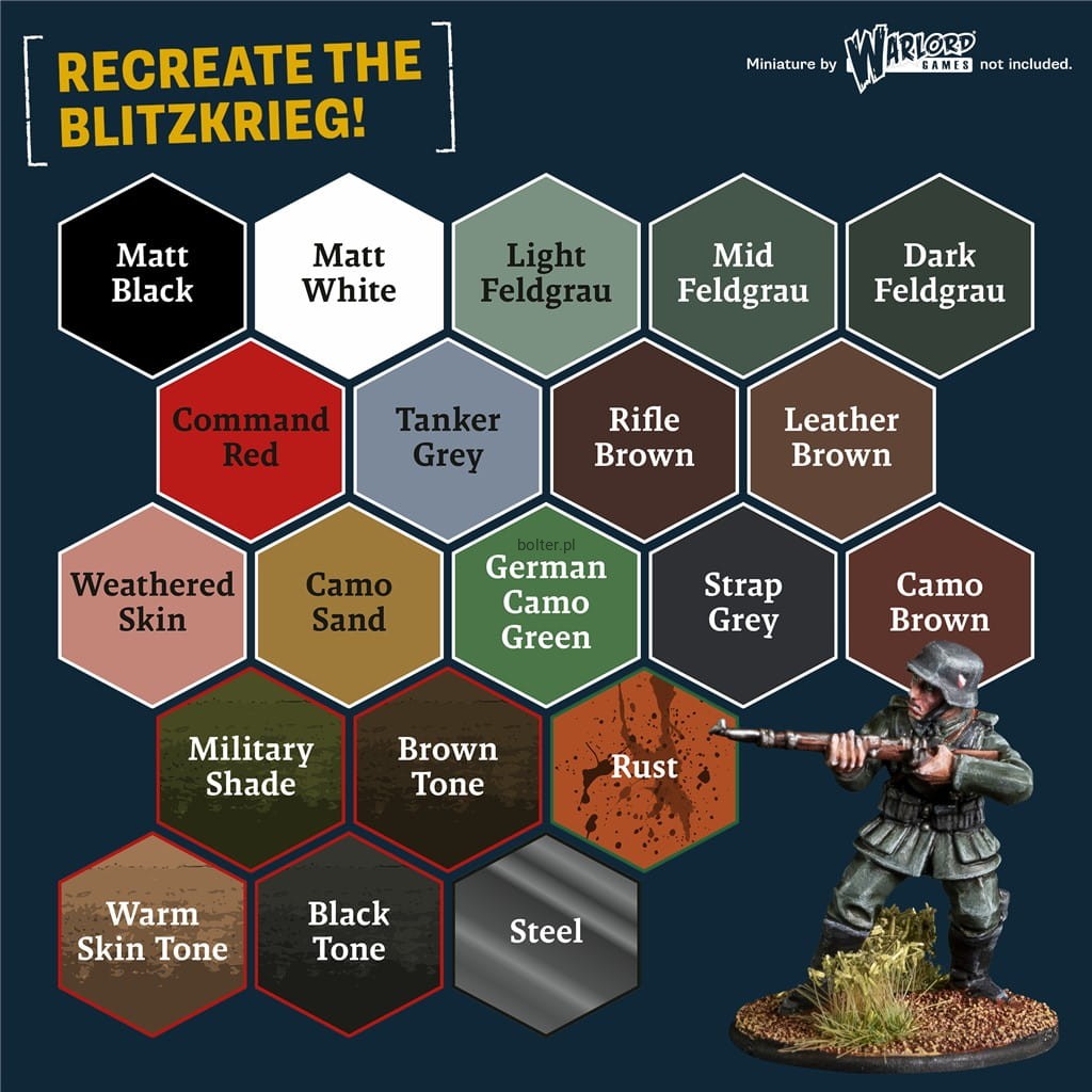 W środku znajdziesz wysokiej jakości akrylowe farby Warpaints Fanatic, Washe i Metaliki - zarówno klasyczne kolory, jak i zupełnie nowe barwy, stworzone specjalnie dla tej serii. Od feldgrau po kamuflaż pustynny - ten zestaw pozwoli Ci z niesamowitą precyzją oddać realia frontu.