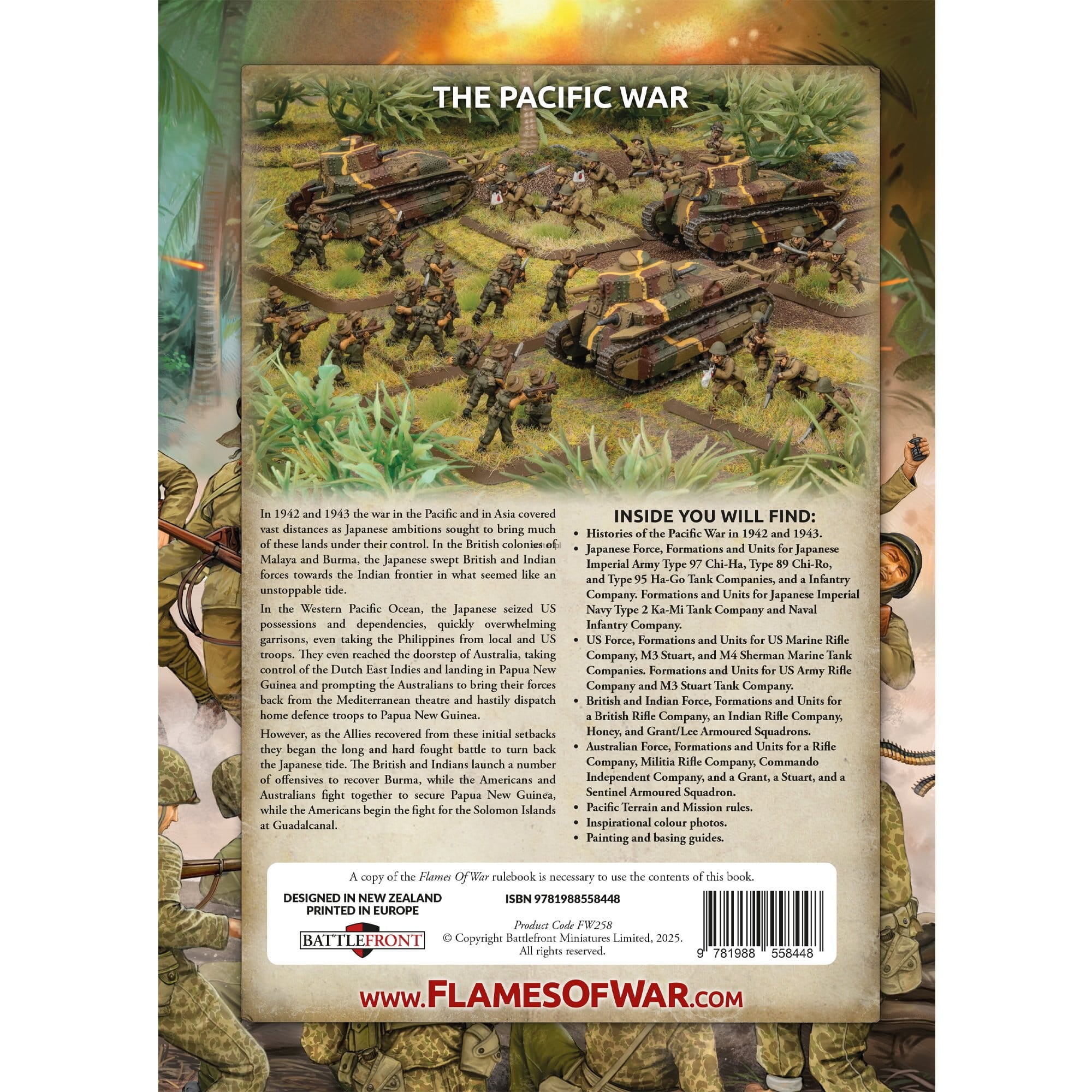 With each copy of The Pacific, 1942 - 1943 you will find a copy of the full catalogue, detailing all the Flames Of War miniatures and accessories found in the Pacific book. Use this as a point of reference to get to know your opponent's potential army composition or to help plan the next additions to your own army.