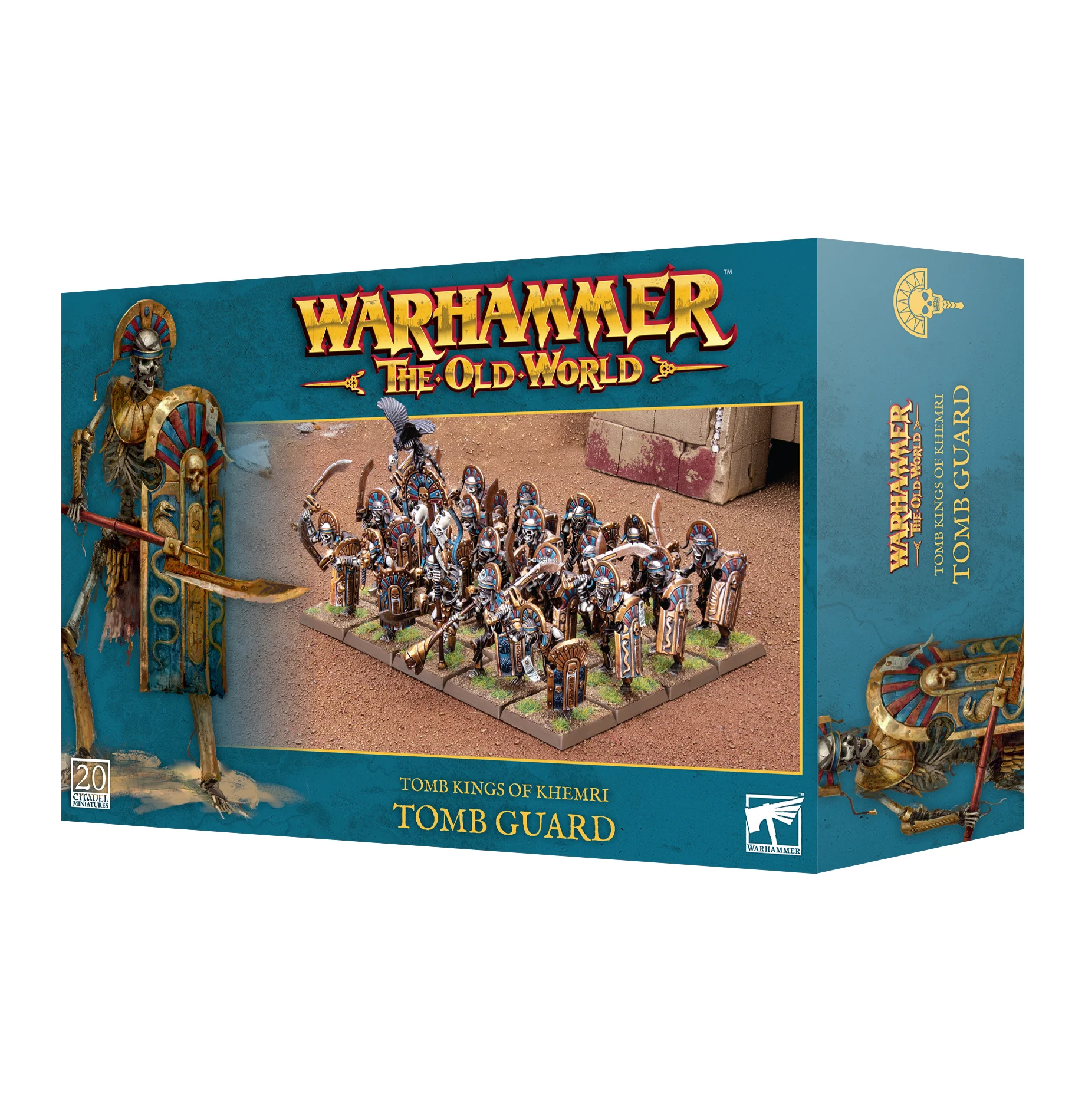 This multipart plastic kit builds 20 Tomb Guard, the elite skeletal infantry of the Tomb Kings of Khemri. Each Tomb Guard is clad in light armour and scraps of mummified wrappings, carries a finely decorated shield, and can be armed with a bladed hand weapon or a sweeping halberd. This kit also provides components for all the command upgrades you'll need, whether you choose to field your Tomb Guard in small groups or as one large phalanx – you can build musicians, standard bearers with optional vultures to sit atop their icons, and Tomb Captains with ornate wargear and death masks.
