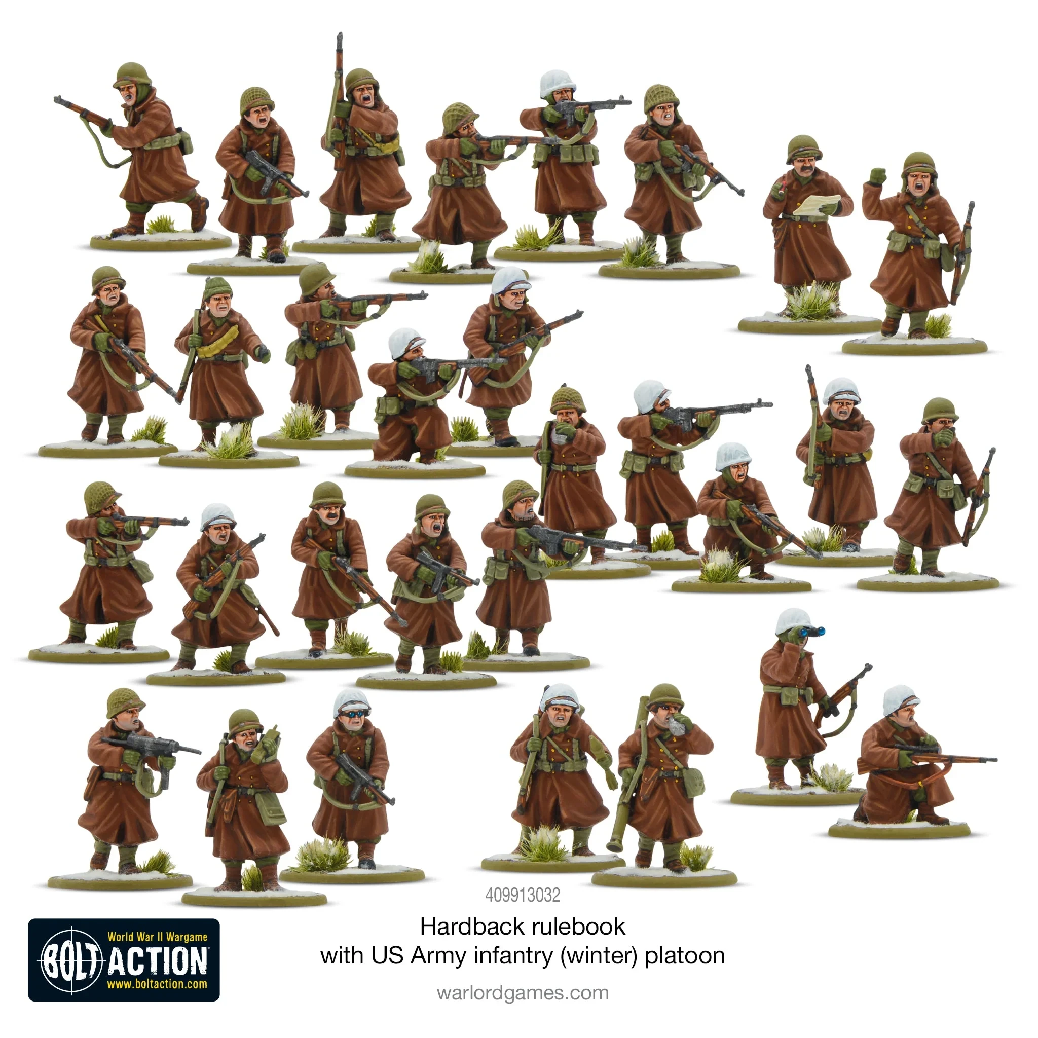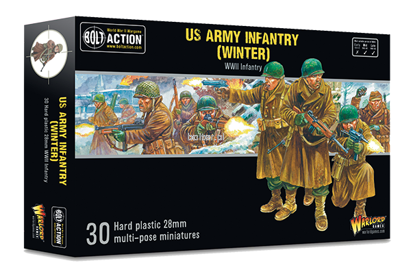 This box gives you everything you'll need to build 30 US Army infantrymen in winter uniforms, ideal for representing the men fighting in the freezing conditions of the Battle of the Bulge.
