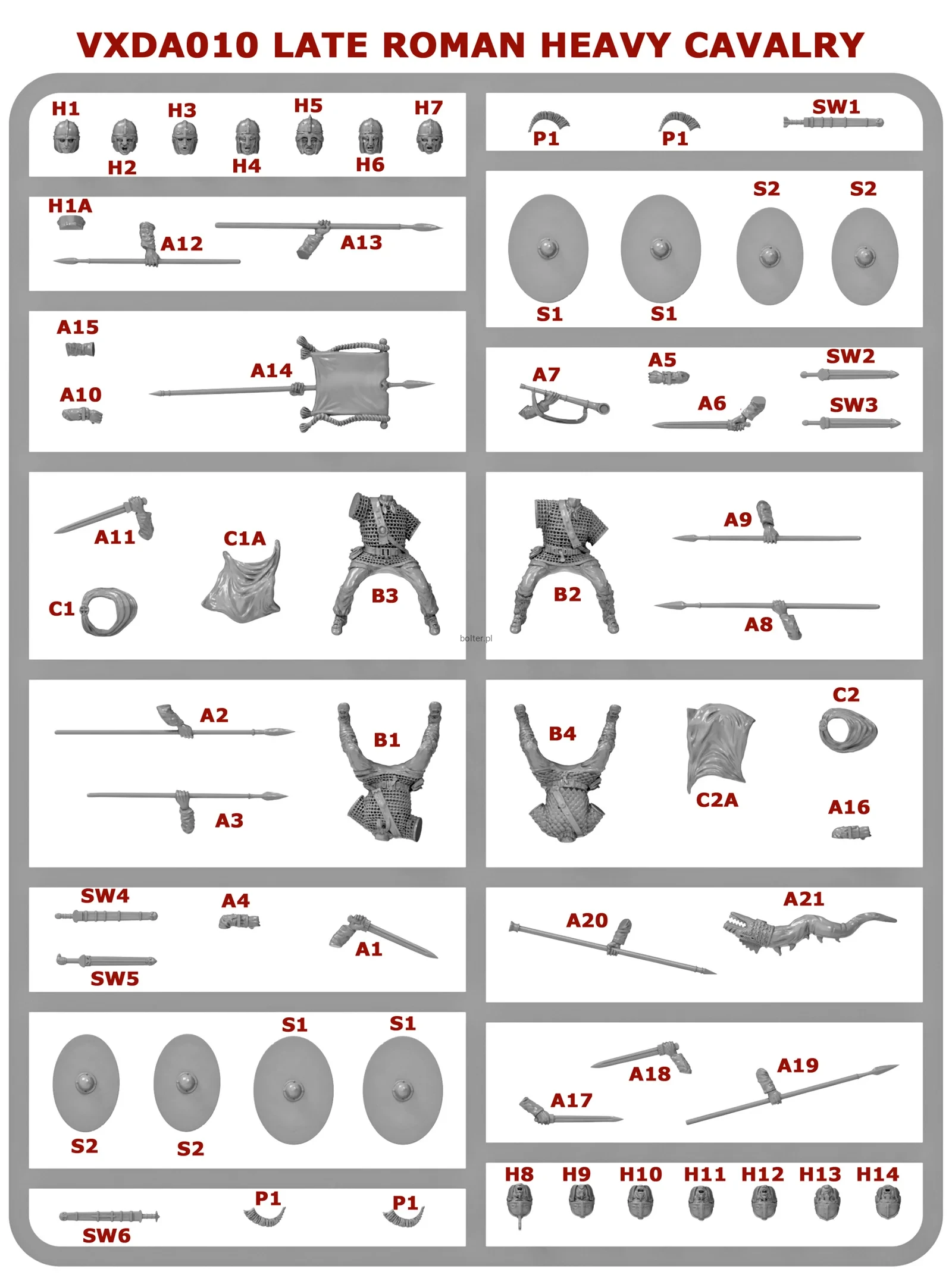 There are many and varied head and arm options with spears, javelins and swords plus standard bearer and musician arms. We have some cloaks to make your command figures stand out from the troopers.
