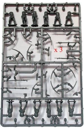 The box contains 40 plastic 28mm infantry figures (i.e. bodies, 14 different), including four fully armoured command and enough parts to build up to 18 billmen (i.e. pairs of arms with polearms) and up to 30 archers (i.e. pairs of arms with bows/arrows). There are additional arms for the command to allow you to build two standard bearers, and also pairs of arms with trumpets. 56 heads are included.